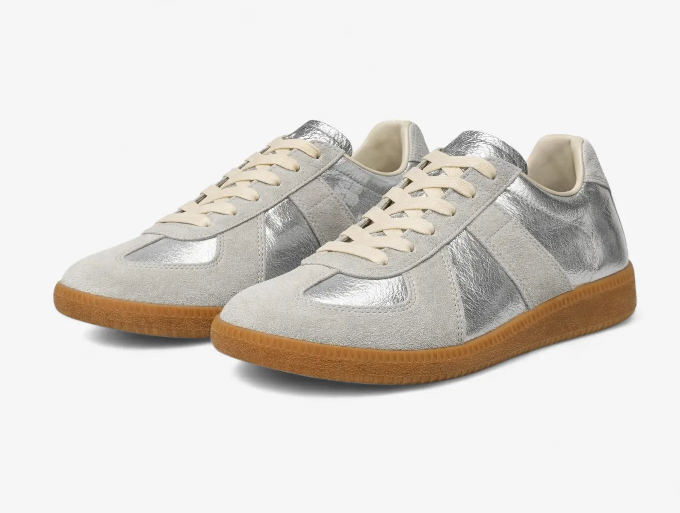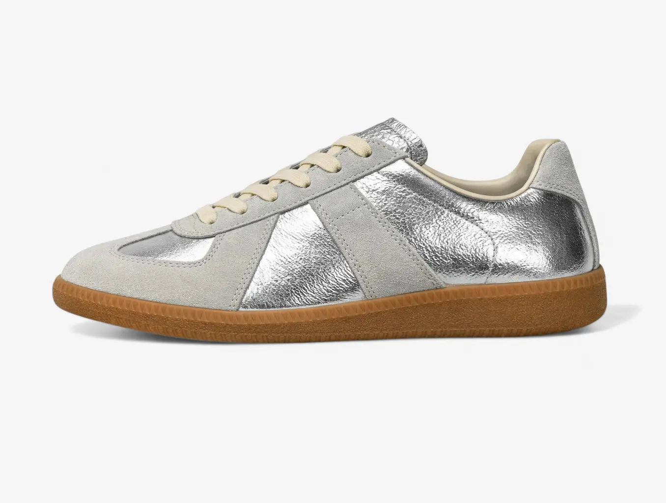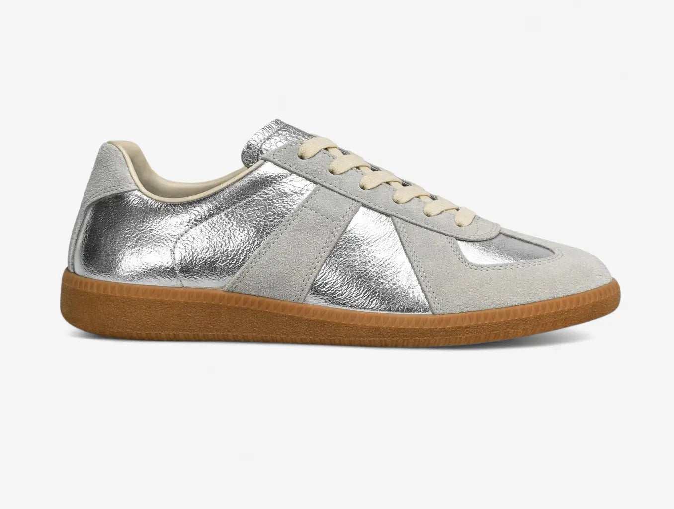 Built from a dual-material upper — soft grey suede meets crinkled metallic silver leather — this sneaker brings quiet luxury to everyday wear. The contrast paneling gives it structure and edge without loudness. A warm gum rubber sole grounds the look with just enough vintage character. Pair it with denim, tailored trousers, or an evening fit — it holds its own either way.